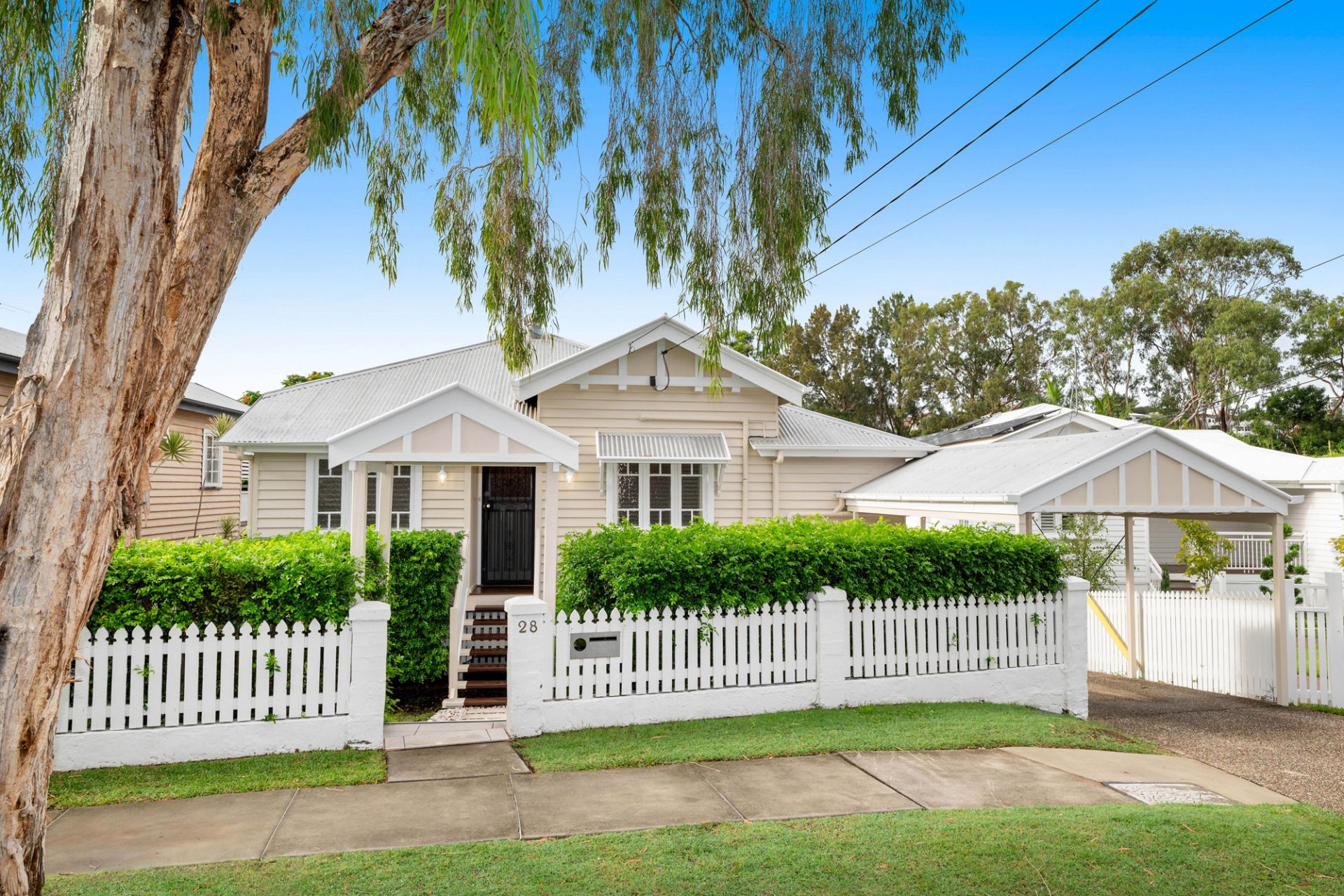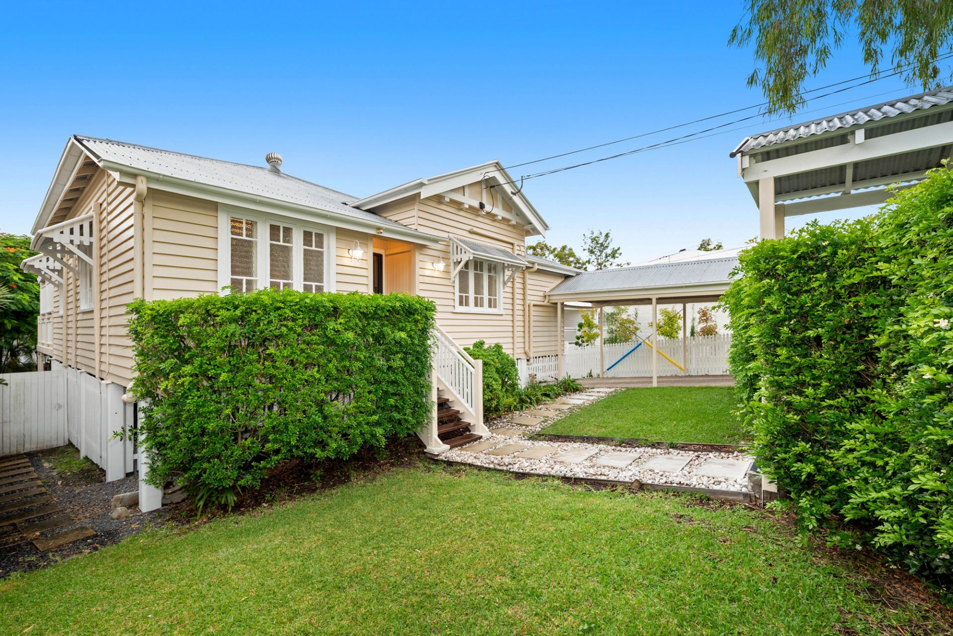 3 air-conditioned bedrooms, Master with a walk in robe, and another bedroom with built in robe, 2 bathrooms including ensuite, study off of the dining space, separate lounge, French provincial kitchen, polished floorboards in the living spaces and carpeted bedrooms, high ceilings, a very large back deck, picturesque pool and gardens and secure back yard, lots of under house storage, and a single car carport.